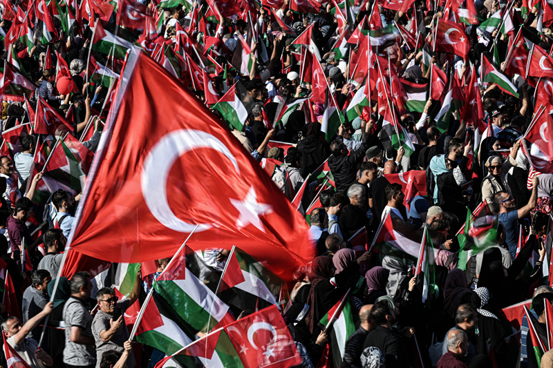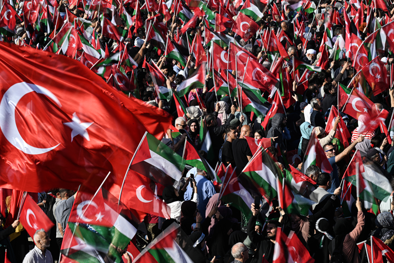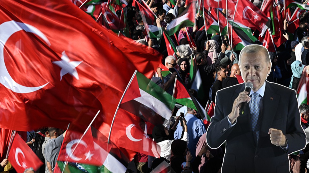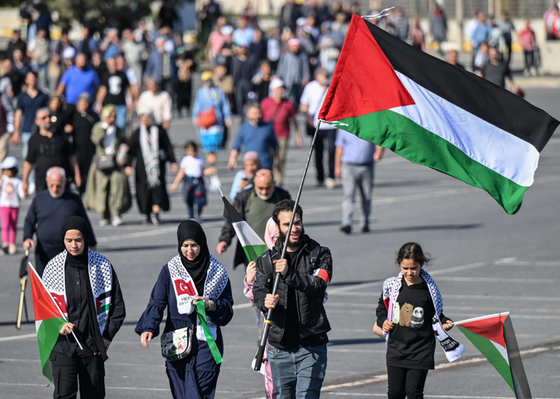 Sabahtan itibaren alanda yerlerini alan katılımcılar, yanlarında getirdikleri büyüklü küçüklü Türk ve Filistin bayraklarını sallarken, zaman zaman da İsrail aleyhine slogan atıyor.