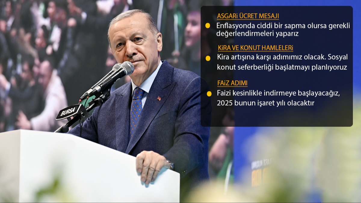 Erdoğan, "Para politikasının yanı sıra uhdemizdeki diğer araçları da devreye alarak inşallah enflasyonu olması gereken seviyeye indireceğiz. Tabii bununla bir yere geliyorum. Faizi kesinlikle indirmeye başlayacağız. 2025, bunun işaret yılı olacaktır. Faiz inecek ki enflasyon da insin. Bu adımı atacağız. Bu bizim artık olmazsa olmazımız." dedi.