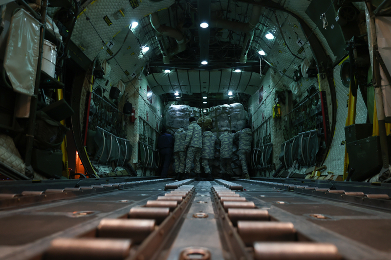 Türkiye'ye yollanan çadır ve giysiler, TSK'ya ait askeri kargo uçaklarıyla deprem bölgesine naklediliyor.