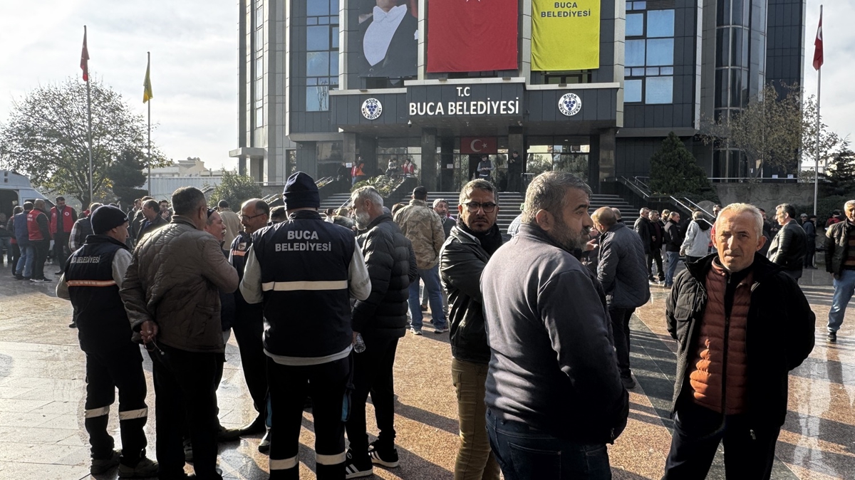 Grev yapan işçiler, DİSK Genel İş İzmir 5 Nolu Şubesi öncülüğünde belediye binası önünde toplandı.