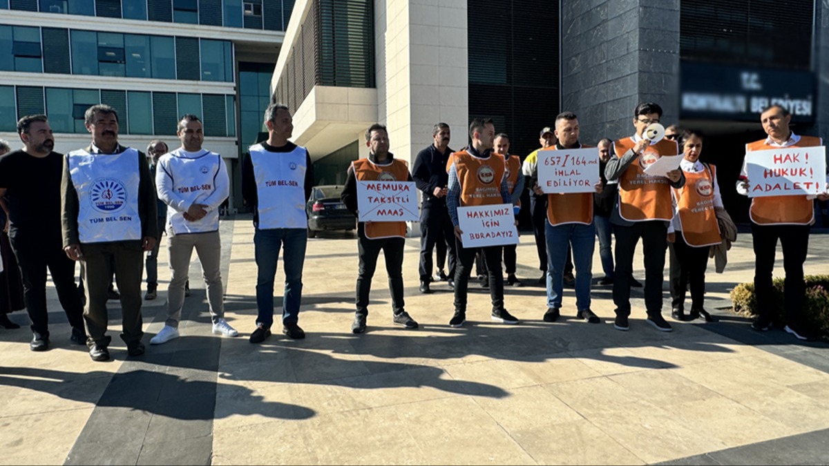 Belediye önünde bir araya gelen Bağımsız Yerel Hak-Sen ve Tüm Bel-Sen üyeleri ile bazı belediye çalışanları ellerinde "Memura taksitli maaşa hayır", "Hakkımız için buradayız" ve "Hak, hukuk, adalet" yazılı dövizler taşıyıp, slogan attı.