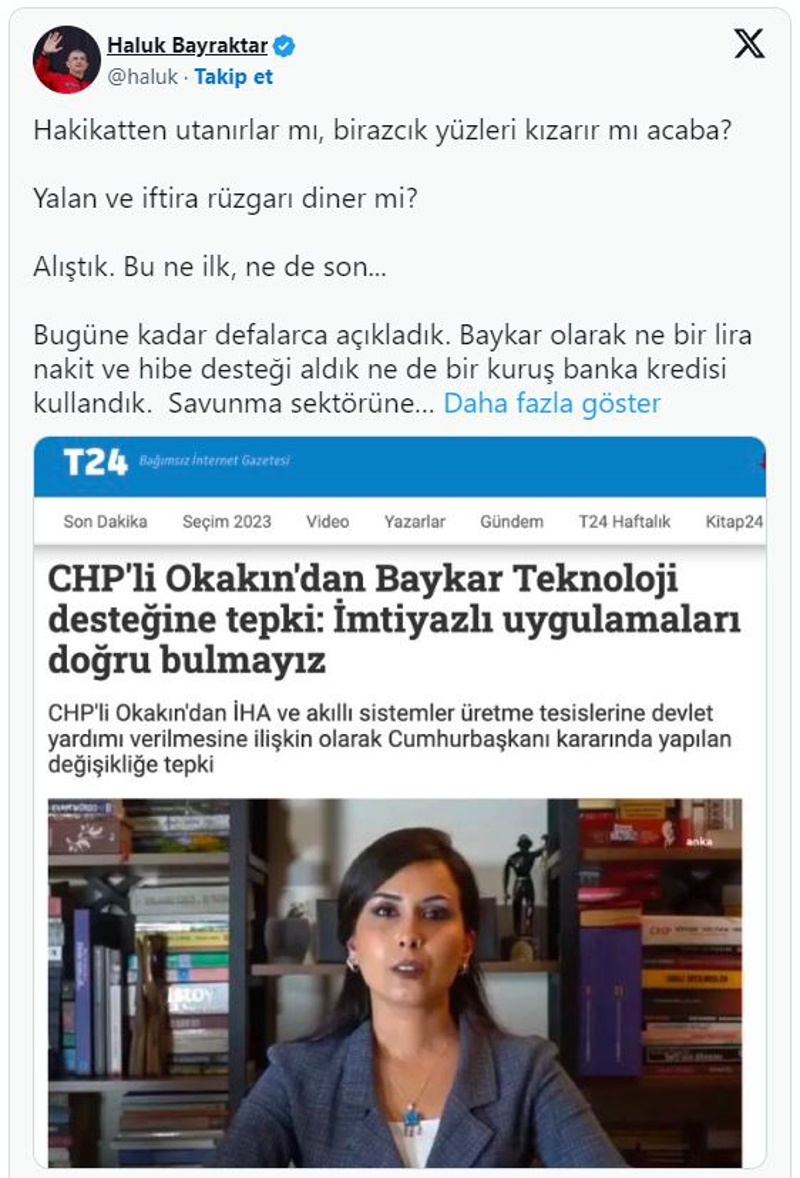 Baykar Genel Müdürü Haluk Bayraktar, CHP'li Pınar Uzun Okakın'ın Baykar ile ilgili asılsız iddialarına sert tepki gösterdi. Haluk Bayraktar, bugüne kadar Baykar'ın nakit ve hibe desteği almadığını ifade etti.