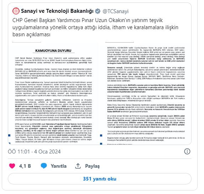 Selçuk Bayraktar sosyal medya hesabından yaptığı paylaşımda, "Yabancı yatırımcı hem tüm teşviklerden hem de tüm nakit ve hibe desteğinden faydalanırken bu destekleri kullanmayan milli bir firmaya bu tepki niye? Yatırıma hem de stratejik yatırıma düşmanlığın sonu yok" ifadelerini kullandı.