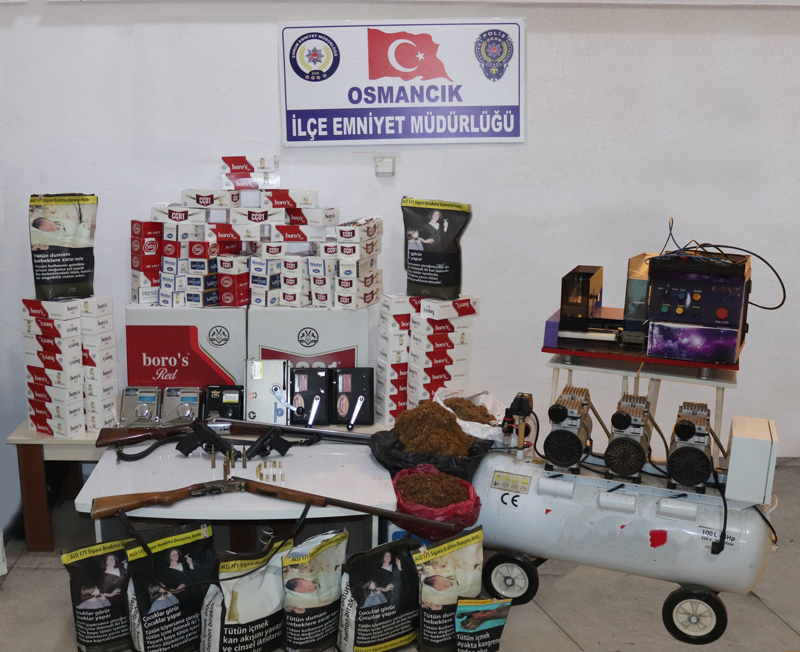 Adreslerde ve bir araçta yapılan aramada 10 bin 400 boş makaron (filtreli sigara kağıdı), 4 bin dolu makaron, 11 kilogram kıyılmış tütün, 8 sigara sarma makinesi, 2 tüfek ve 2 kurusıkı tabanca ele geçirildi.