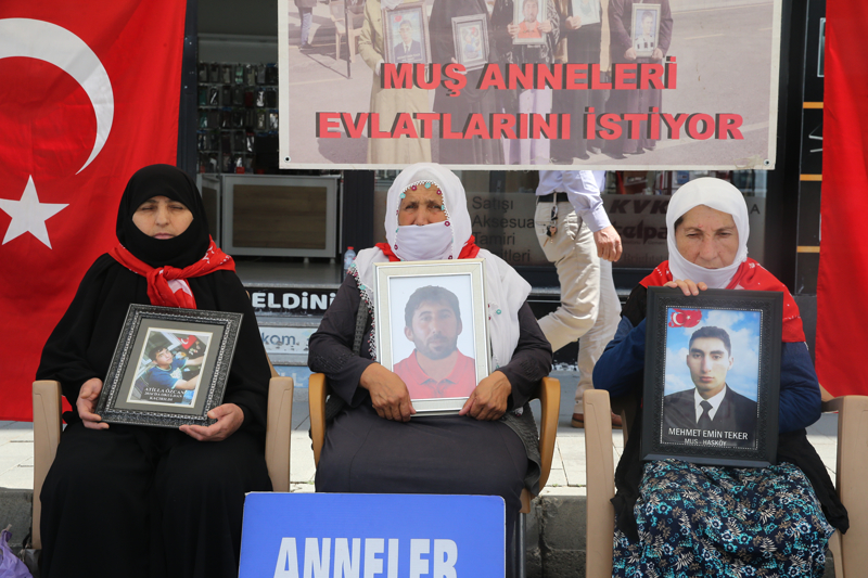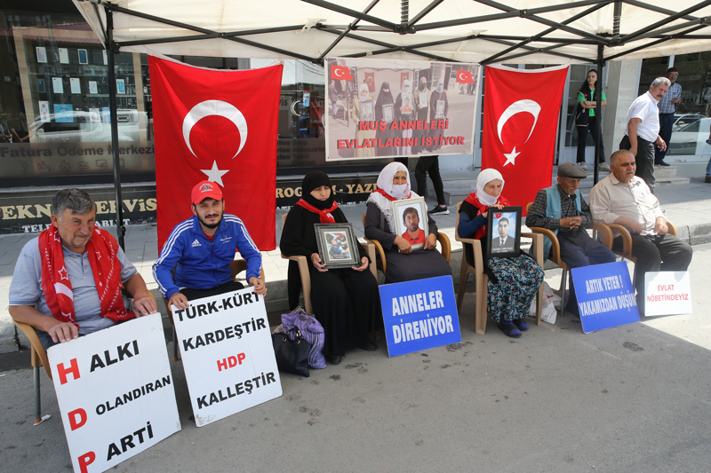 "Evlat nöbetindeyiz", "Anneler direniyor" ve "Artık yeter yakamızdan düşün" yazılı pankartlar açan anne ve babalar, fotoğraflarını taşıdıkları çocuklarına teslim olmaları için çağrıda bulundu.