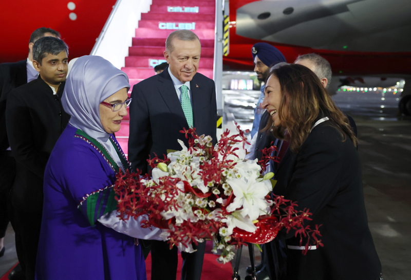 Erdoğan ve eşi Emine Erdoğan'la Dışişleri Bakanı Hakan Fidan, Hazine ve Maliye Bakanı Mehmet Şimşek, MİT Başkanı İbrahim Kalın, Cumhurbaşkanlığı İletişim Başkanı Fahrettin Altun, Cumhurbaşkanı Başdanışmanı Büyükelçi Akif Çağatay Kılıç ve bazı yetkililer de Yeni Delhi'ye geldi.