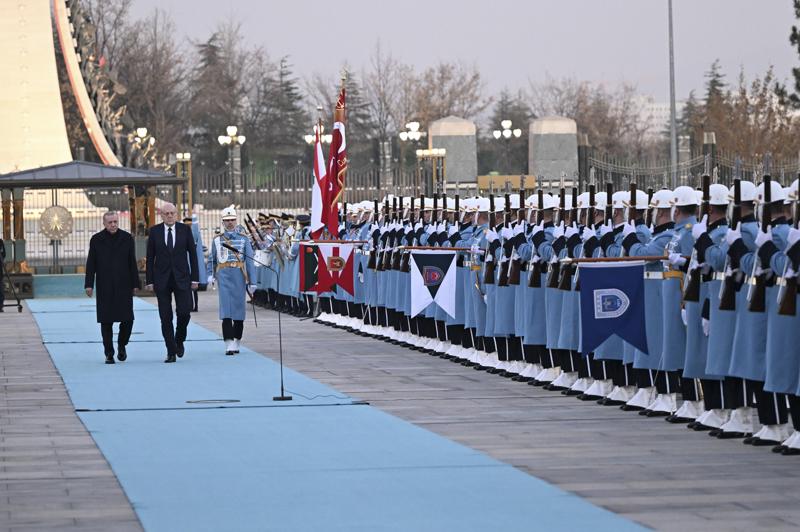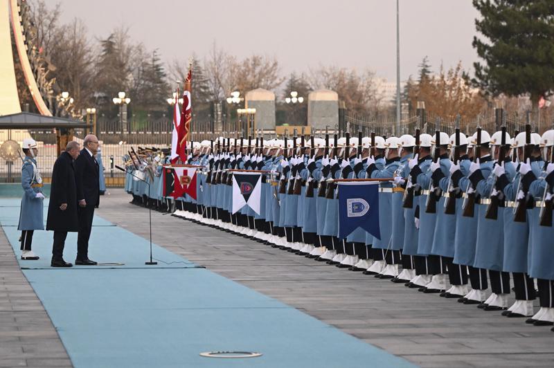 Cumhurbaşkanı Erdoğan ve Mikati'nin tören alanındaki yerlerini almalarının ardından, 21 pare top atışı eşliğinde iki ülkenin milli marşları çalındı. Mikati, Muhafız Alayı Tören Kıtası'nı 'Merhaba Asker' diyerek selamladı. Törende, tarihte kurulan 16 Türk devletini temsil eden bayraklar ve askerler de yer aldı.