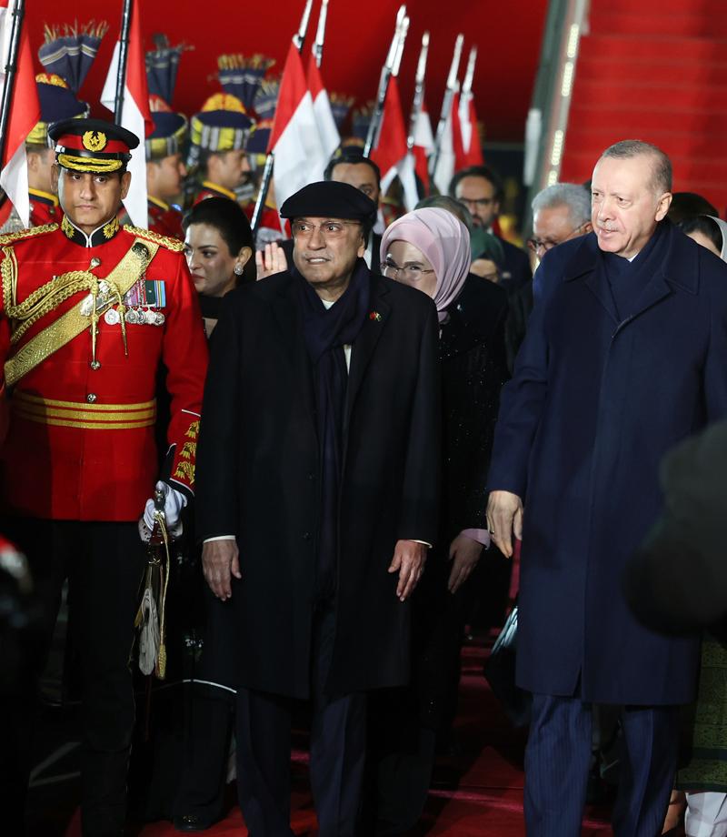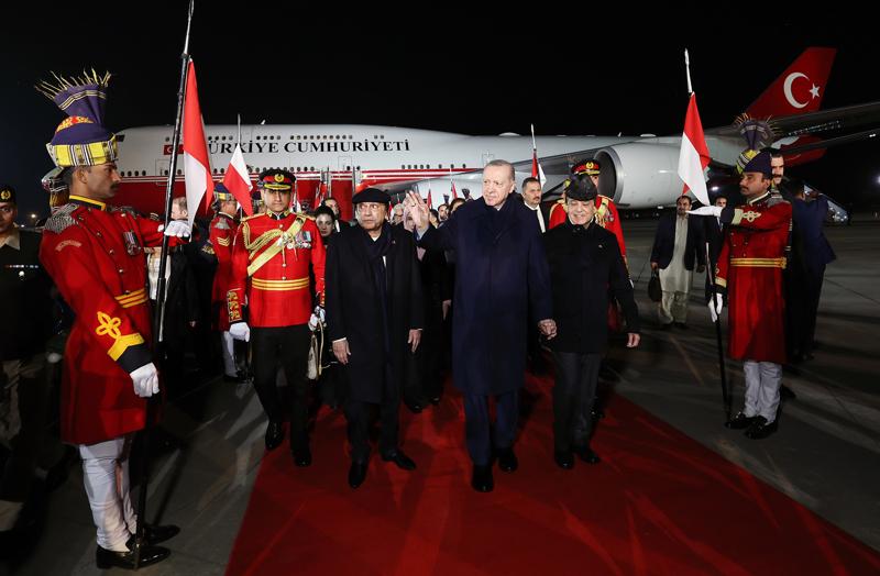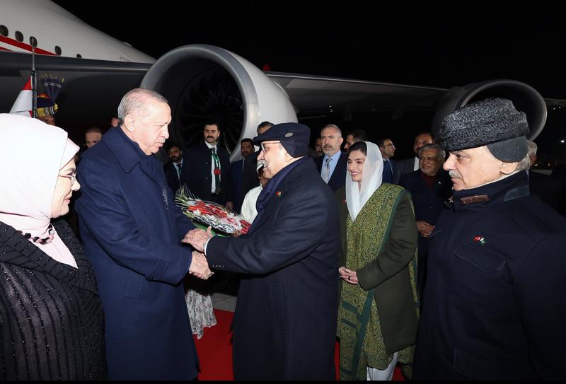 Cumhurbaşkanı Erdoğan'ı, İslamabad Nur Khan Hava Üssü'nde, Pakistan Cumhurbaşkanı Asif Ali Zerdari, Pakistan Başbakanı Şahbaz Şerif, Pakistan Başbakan Yardımcısı ve Dışişleri Bakanı Senatör Mohammad Ishaq Dar, Pakistan Savunma Bakanı Khawaja Asif, Pakistan Cumhurbaşkanı Zerdari'nin kızı Aseefa Bhutto Zerdari, Türkiye'nin İslamabad Büyükelçisi İrfan Neziroğlu ve eşi Emine Neziroğlu ile diğer yetkililer karşıladı.