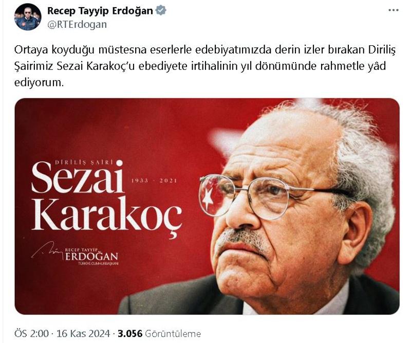 Cumhurbaşkanı Erdoğan, sosyal medya hesabından yaptığı paylaşımda, "Ortaya koyduğu müstesna eserlerle edebiyatımızda derin izler bırakan Diriliş Şairimiz Sezai Karakoç'u ebediyete irtihalinin yıl dönümünde rahmetle yad ediyorum." ifadelerini kullandı.