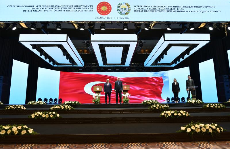 Törende, iki ülkenin milli marşlarının okunmasının ardından Cumhurbaşkanı Erdoğan, Mirziyoyev'e Türkiye Cumhuriyeti Devlet Nişanı tevcih etti.
