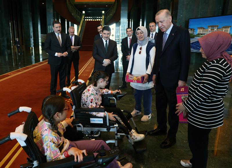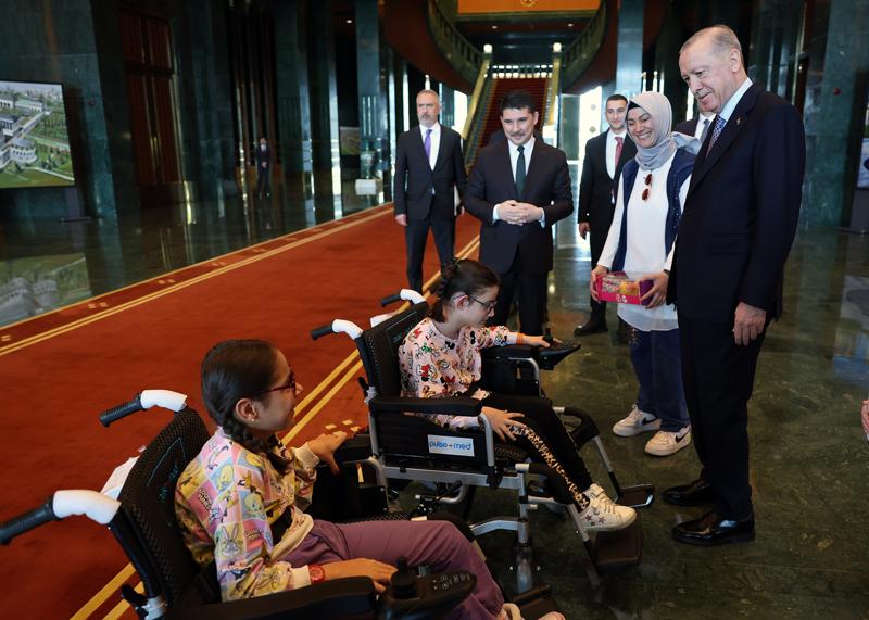 AKÜLÜ TEKERLEKLİ SANDALYE HEDİYE EDİLDİTalebin iletildiği Erdoğan, çocukları Cumhurbaşkanlığı Külliyesi'nde ağırladı ve kendilerine akülü tekerlekli sandalye hediye etti.