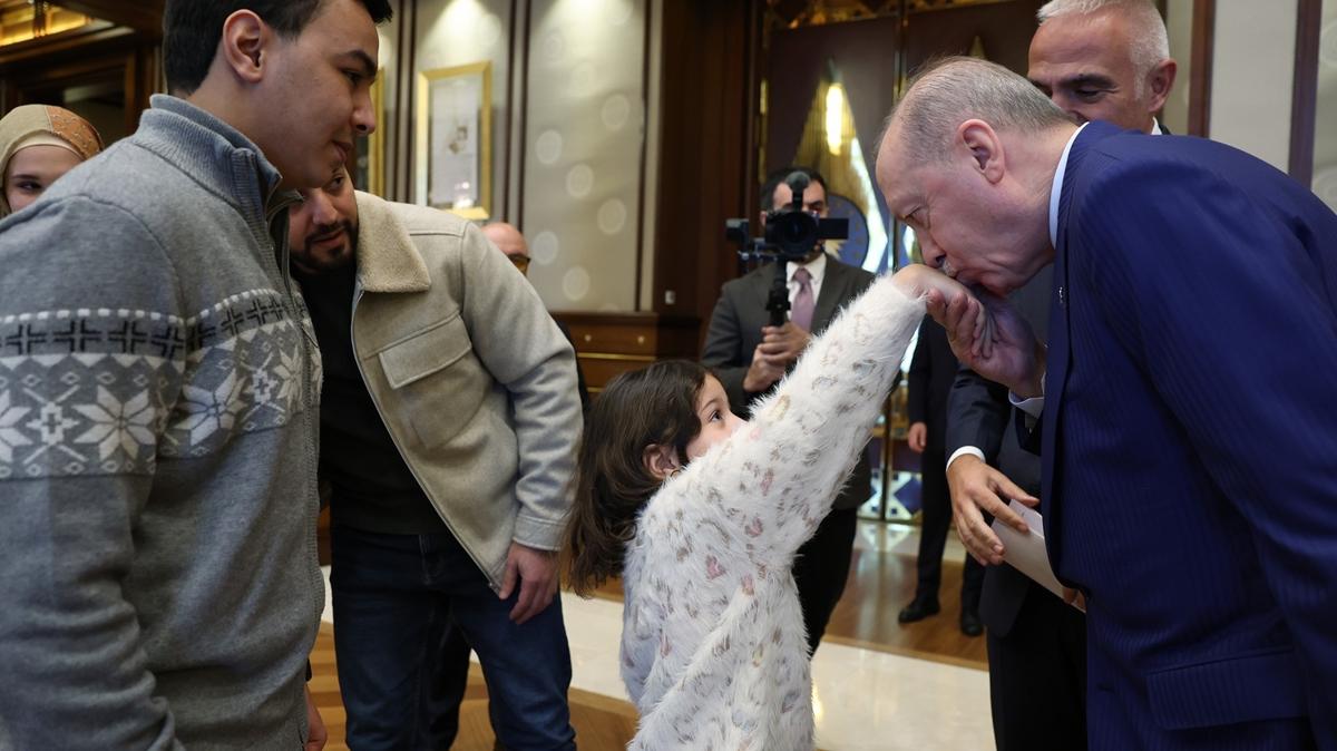 Cumhurbaşkanı Erdoğan, Cumhurbaşkanlığı Külliyesi'ndeki kabulde, aile fertleri arasında yer alan çocuklara özel ilgi gösterdi.