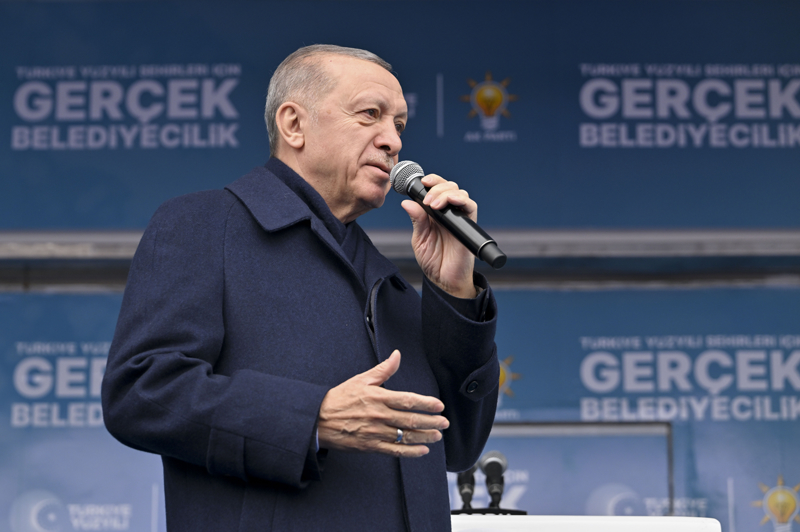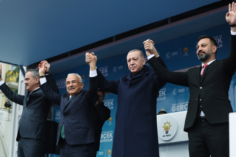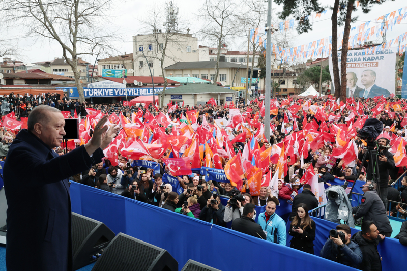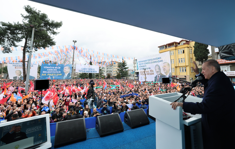 Her fırsatta, siyasetlerinin eser ve hizmet siyaseti olduğunu vurguladıklarını belirten Erdoğan, "Bizim ne dünün CHP'si gibi arkamızda tek parti faşizminin utancı var, ne de bugünün CHP'si gibi kendi iç kavgasından başını kaldıramayan yalan üzerine kurulu bir siyasetimiz var. Biz tüm samimiyetimizle ve gücümüzle ülkemizin önünde yeni ufuklar açmanın, şehirlerimizi de bu vizyona ayak uyduracak yönetimlere kavuşturmanın gayreti içindeyiz. Bu anlayışla hasret gidermek ve vatandaşımızın sandıkta desteğini istemek için gittiğimiz hemen her şehirde rakiplerimize meydan okuyoruz." ifadelerini kullandı.