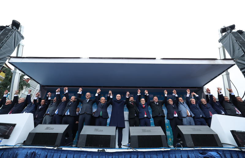 Erdoğan, belediye başkan adaylarını Ordu halkına emanet ettiğini belirterek, "Sizlerden tekrar söz almak istiyorum. Ordu, 31 Mart'ta sandıkları patlatıyor muyuz? Ordu, 31 Mart'ta, Ordu haritasının tamamını Cumhur İttifakı'nın renkleriyle boyuyor muyuz? Hanımlar, 31 Mart'a kadar çalmadık kapı bırakmadan çalışıyor muyuz? Gençler, 31 Mart'a kadar her sokağı, her meydanı heyecanınızla ve gayretinizle şölen yerine çeviriyor muyuz? Ben de Ordu'nun sözünü tutacağını biliyorum, buna inanıyorum." dedi.