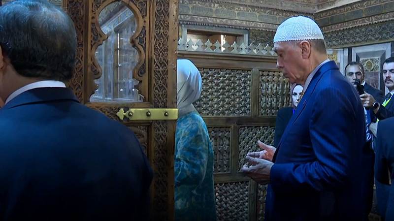 Türbede dua edip yetkililerden bilgi alan Cumhurbaşkanı Erdoğan ve eşi Emine Erdoğan'a, Mısır Cumhurbaşkanı Abdulfettah es-Sisi ve eşi de eşlik etti.