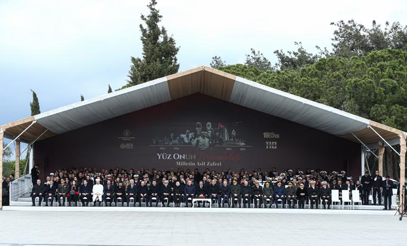 "Suriye'den Kafkasya'ya, Afrika'daki anlaşmazlıklardan Libya iç savaşının çözümüne kadar üstlendiğimiz yapıcı inisiyatif ve çatışmaları önlenme çabası, ülkemizin barışa katkıda bulunma kabiliyetini net bir şekilde ortaya koymuştur. Çanakkale'de yedi düvele karşı nasıl kahramanca mücadele verdiysek arkasında birçok karanlık odağın bulunduğu terör örgütlerine karşı da aynı azim ve inançla mücadelemizi verdik, vermeye devam ediyoruz. Terörsüz Türkiye hedefiyle Türkiye Yüzyılı'nı huzurun ve kardeşliğin yüzyılı yapmaya kararlıyız. İşte bütün bu adımlar, karşımızdaki sınamalar ne kadar büyük olursa olsun, mücadele azmimizden ve kararlılığımızdan dönmeyeceğimizin göstergesidir. Çünkü biz, tarih boyunca her türlü zorluğu aşmış, birlik ve beraberlik içinde başarılara, zaferlere ulaşmış bir milletiz."