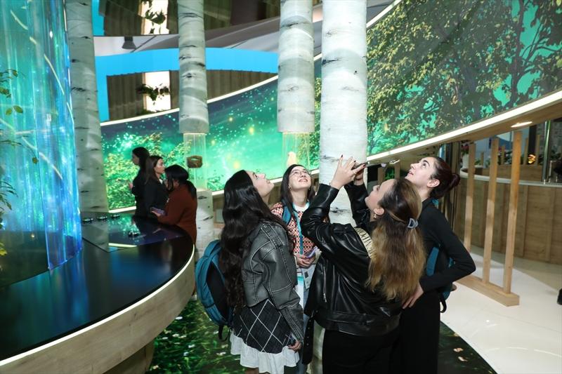 Dijital tanıtımları ilgiyle izleyen ve yetkililerden bilgi alan ziyaretçiler, pavilyonun önünde fotoğraf çektiriyor.