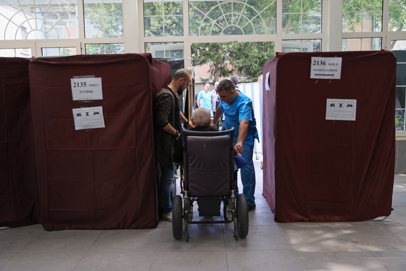 Kurum görevlileri tarafından odalarından alınarak oy kullanma alanına getirilen sakinler, hastalık ve ihtiyaç durumlarına göre sırayla sandık başına getirildi.