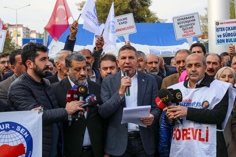 Hizmet-İş Diyarbakır Şube Başkanı Ercan Kahraman, sendika üyeleri ve bazı belediyelerde işten çıkarılan işçiler, Diyarbakır Büyükşehir Belediyesi binasının yanında kurdukları çadırda eylemi sürdürüyor.