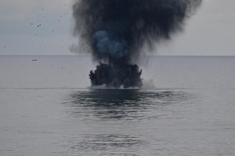 Sahil Güvenlik Komutanlığının botu ile Karadeniz açıklarına çekilen insansız deniz aracının, bir süre sonra patlatıldığı görüldü.