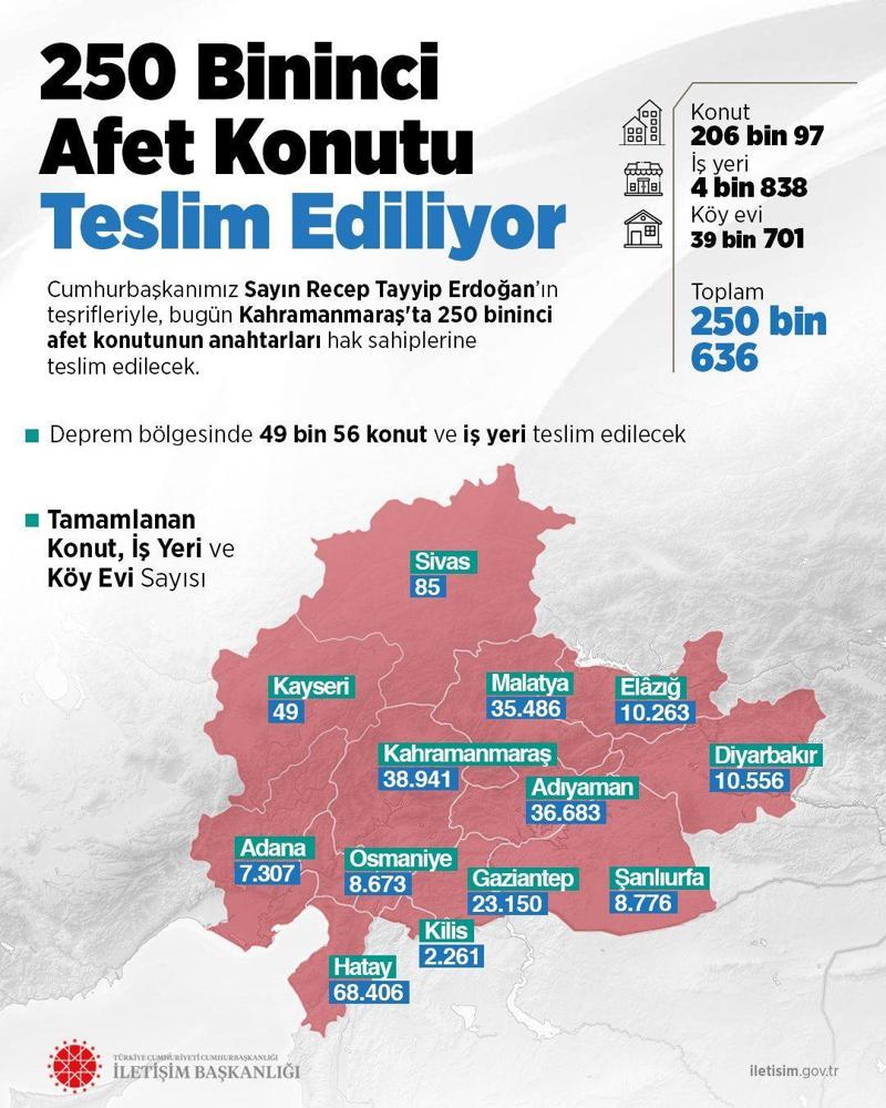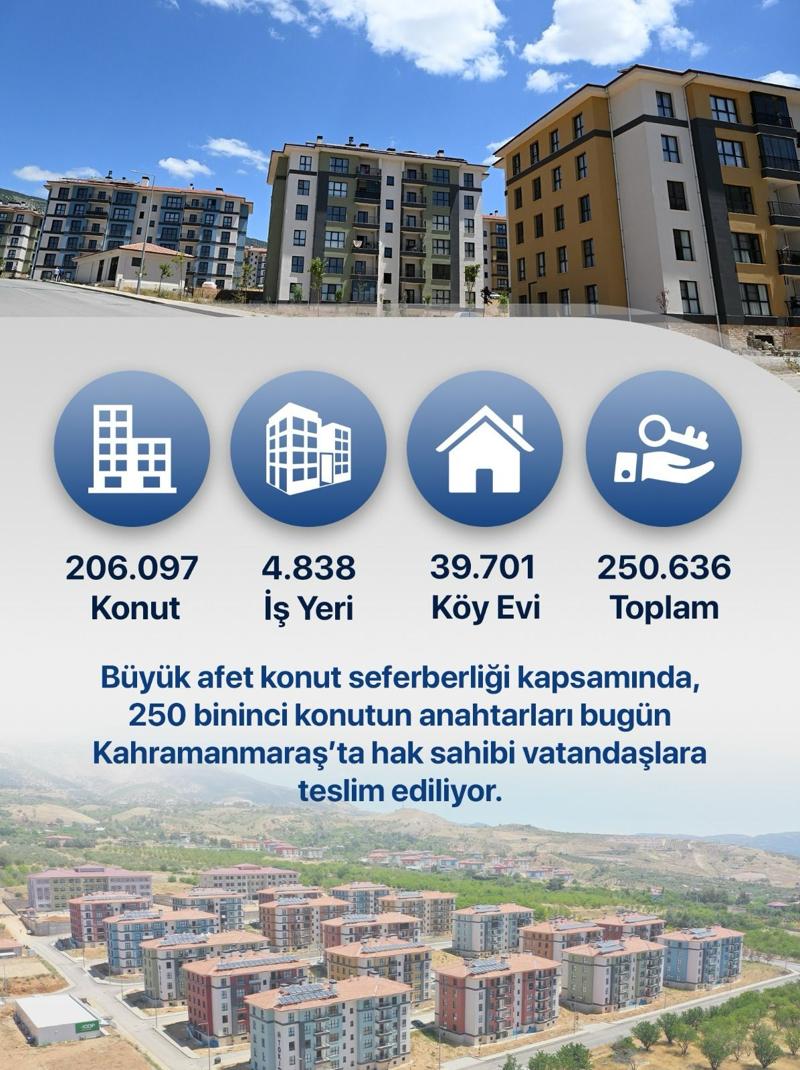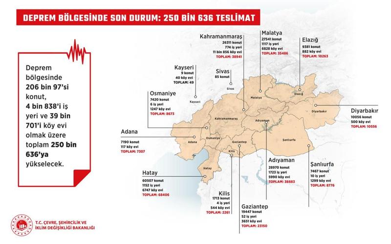 Yeni konutların teslimatıyla birlikte deprem bölgesi genelinde teslim sayıları 206 bin 97'si'i konut, 4 bin 838'i iş yeri ve 39 bin 701'i köy evi olmak üzere toplam 250 bin 636'ya yükseldi.
