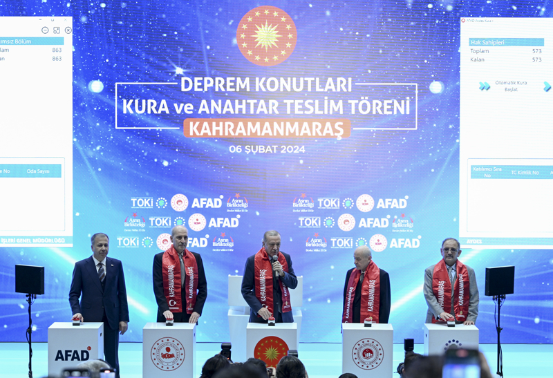 Cumhurbaşkanı Erdoğan, TBMM Başkanı Numan Kurtulmuş, MHP Genel Başkanı Devlet Bahçeli, İçişleri Bakanı Ali Yerlikaya ve Çevre, Şehircilik ve İklim Değişikliği Bakanı Mehmet Özhaseki birlikte butona basarak hak sahipleri için kura çekimini başlattı.