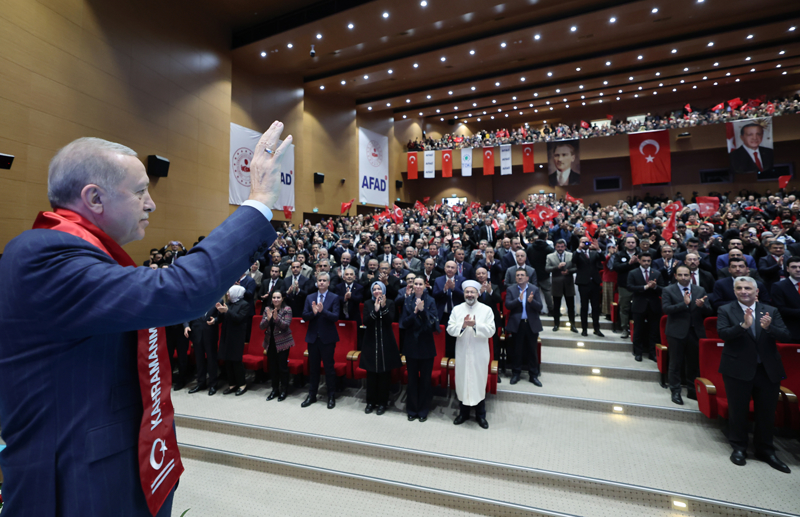 Devlet olarak afetin ilk anından itibaren personel, araç-gereç, milli ve uluslararası tüm imkanları seferber ettiklerinin altını çizen Erdoğan, "Depremin merkezi Kahramanmaraş'tan bir tarafta Malatya, diğer tarafta Kayseri sınırından başlayıp Adıyaman, Gaziantep, Osmaniye ve Hatay'a kadar inen bir felaket tablosuyla karşı karşıyaydık. Hatta depremin yıkım etkisi, oradan sınırlarımızı aşarak devam edip gidiyordu. Depremden etkilenen şehirlerimizde 39 bini yıkılmış, 60 bini acil yıkılacak, 200 bini ağır hasarlı bina ortaya çıkmıştı. Bu binalardan 26 bininde çok acil arama kurtarma çalışması yürütülmesi gerekiyordu." ifadelerini kullandı.