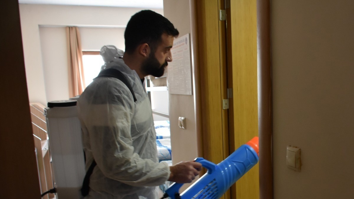 Elazığ Ahmet Kabaklı Öğrenci Yurdunda kalan bin 700'ü aşkın depremzede, bulundukları ve vakit geçirdiği her alan da özellikle insan sirkülasyonunun yoğun olduğu yerlerde bulaşıcı hastalıkların önüne geçmek adına yurtlarda hijyen ve dezenfekte çalışmaları yapılıyor. Yemekhane, lavabo, genç ofisi, mescit, eğitim odaları, çocuk kreşi ve yurt içerisinde bulunan kuaför olmak üzere tüm yaşam alanları dezenfekte ediliyor.