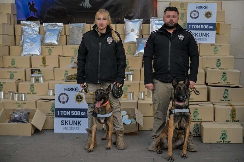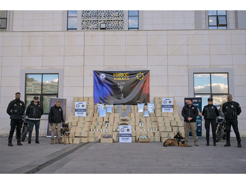 Yakalanan 5 farklı skunk türündeki uyuşturucu madde, Ankara Emniyet Müdürlüğünde basına sergilendi. İl Emniyet Müdürü Engin Dinç de görevli personeli tebrik etti.