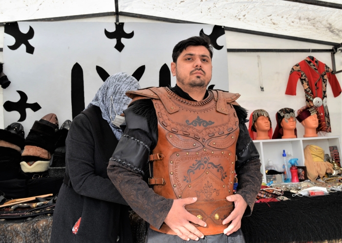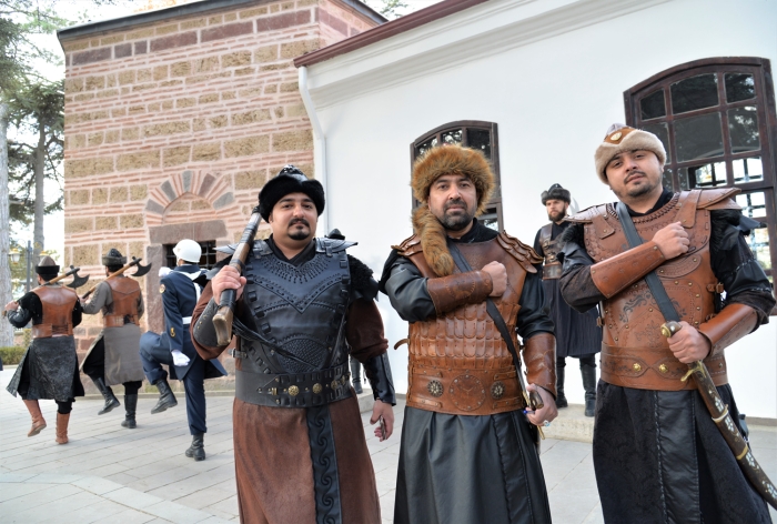 Alp kıyafetleri kiralayarak hatıra fotoğrafı çektiren yabancı konuklar, "saygı nöbeti"ne tanıklık ediyor. Türbe önünde alp kıyafetli askerler tarafından tutulan nöbetin, saat başlarındaki değişim törenini izleyen misafirler, yeni tip koronavirüs Kovid-19 tedbirleri kapsamında bölgeyi geziyor.