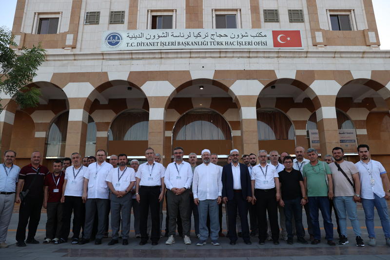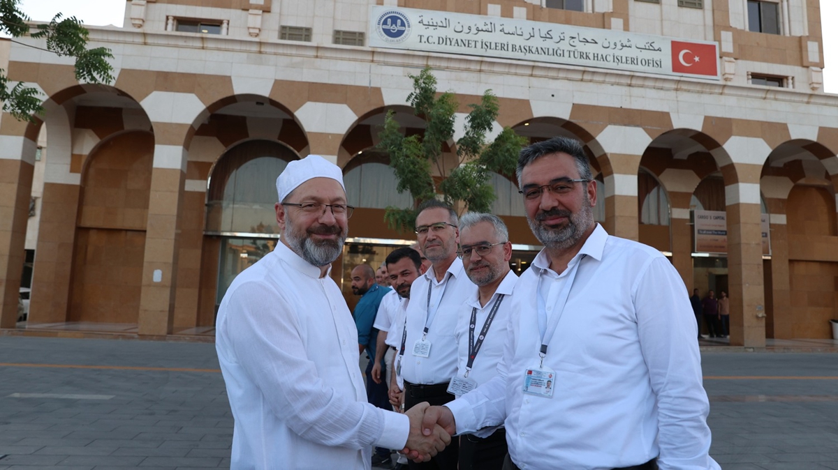 Türk Hac İşleri Ofisi'ni ziyaret eden Erbaş, koordinasyon, iskan, havalimanı ve kargo hizmetlerine ilişkin yetkililerden bilgi aldı.