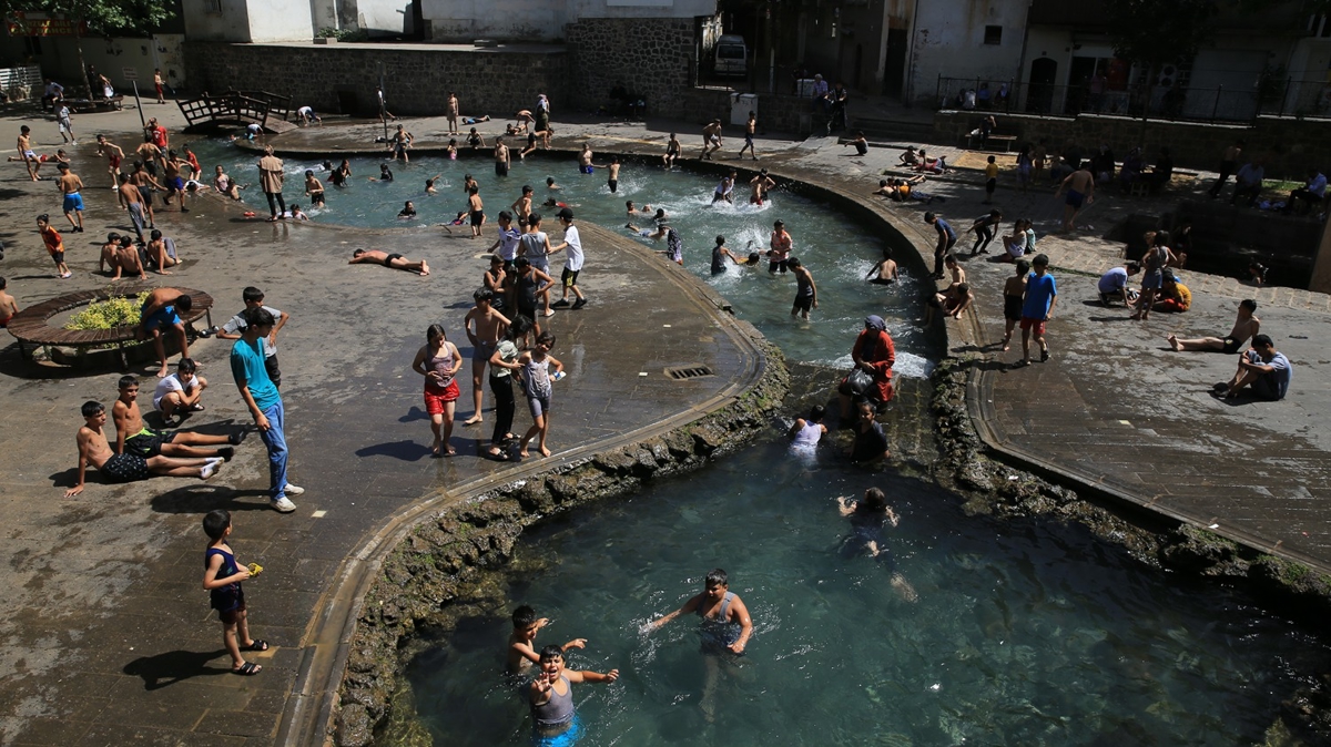 Diyarbakır'da çocuklar Anzele Parkı'ndaki süs havuzunda serinlemeye çalıştı.
