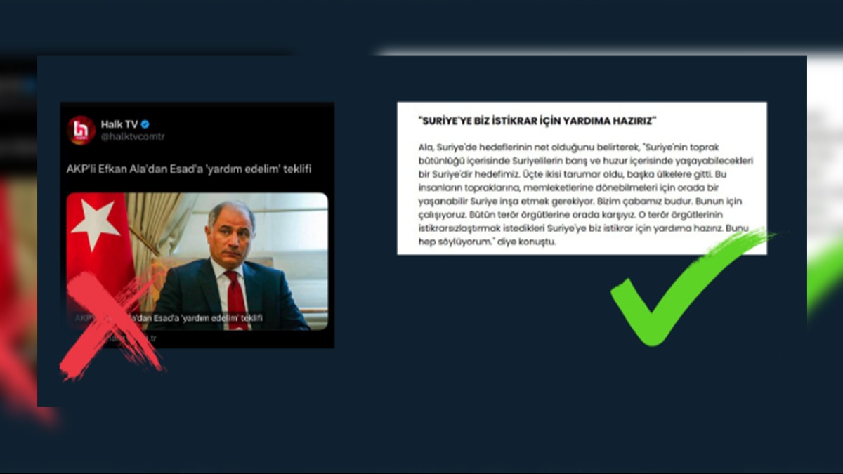 Bazı haber sitelerinin "Efkan Ala'dan Esad'a 'yardım edelim' teklifi" başlıklı manipülatif haberleri asılsız çıktı. DMM'nin resmi X hesabından yayımladığı açıklamada konuya ilişkin şu ifadeler yer aldı: