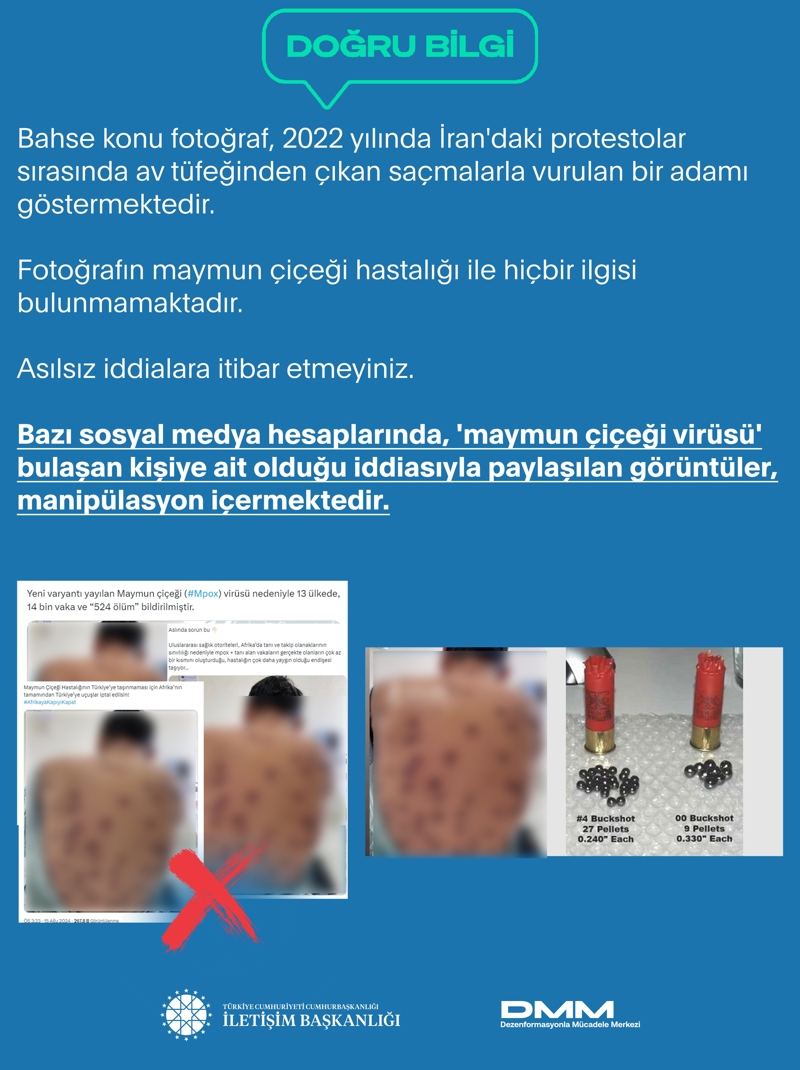 "Bazı sosyal medya hesaplarında, 'maymun çiçeği virüsü' bulaşan kişiye ait olduğu iddiasıyla paylaşılan görüntüler, manipülasyon içermektedir.