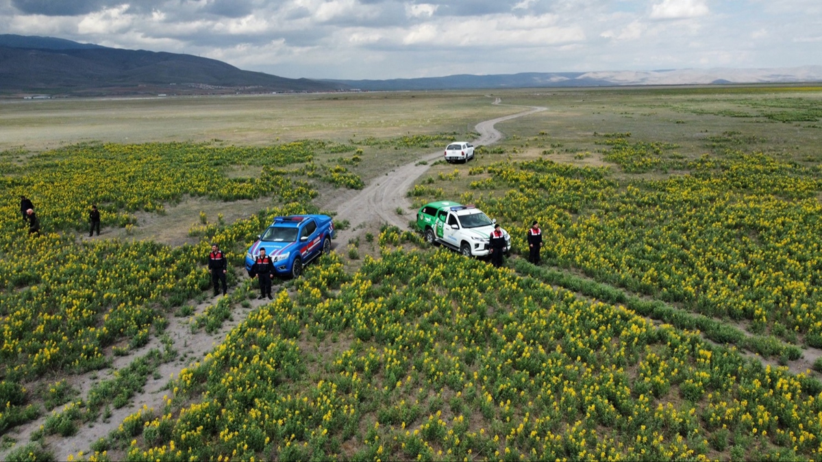 İl Jandarma Komutanlığı Çevre, Doğa ve Hayvanları Koruma Timi ile Doğa Koruma ve Milli Parklar 5. Bölge Müdürlüğü ekipleri, bahar aylarında sarı rengiyle çiçeklenen Eber Sarısı'nın yetiştiği bölgeleri havadan drone ile kontrol ediyor.
