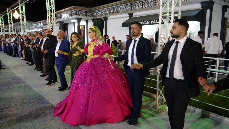 Yurt içi ve yurt dışından 2 binin üzerinde davetlinin katıldığı düğünde yemek ikramı ve takı töreninin ardından davetliler gecenin geç saatine kadar Kürtçe şarkılar eşliğinde halay çekti.