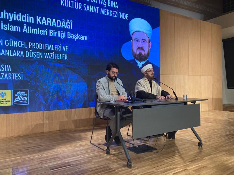 Karadaği, Taş Bina Kültür Sanat Merkezi'nde, Konya Büyükşehir Belediyesi bünyesindeki Konya Okulu'nun ev sahipliğinde düzenlenen konferansta, "Ümmetin güncel problemleri ve Müslümanlara düşen vazifeler" konulu bir konferans verdi.