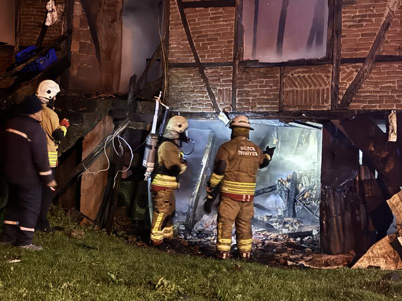 Eminaçma köyünde, F.T'ye ait alt kısmı depo ve garaj olarak kullanılan iki katlı evde bilinmeyen nedenle yangın çıktı.