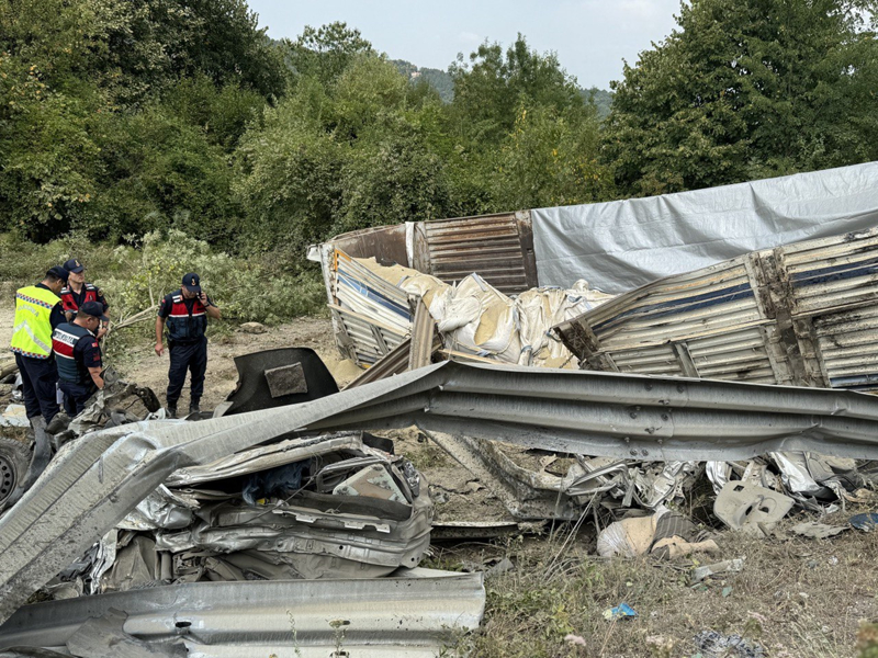 Çarpışmanın etkisiyle tırın kupa kısmı yol kenarında asılı kalırken, otomobil ve tırın dorse kısmı şarampole devrildi.