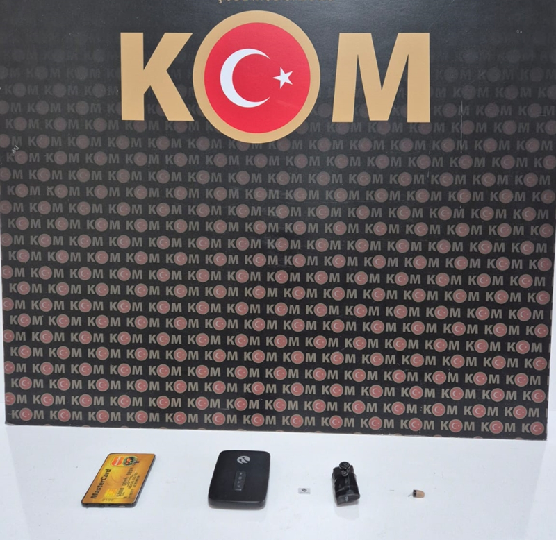 Gözaltına alınan şüphelinin üzerinde, internete bağlantı sağlanan mobil wi-fi cihazı, casus kulaklık, düğme şeklinde kamera, içerisine sim kart entegre edilmiş kredi kartı görünümlü kartlık ele geçirildi.