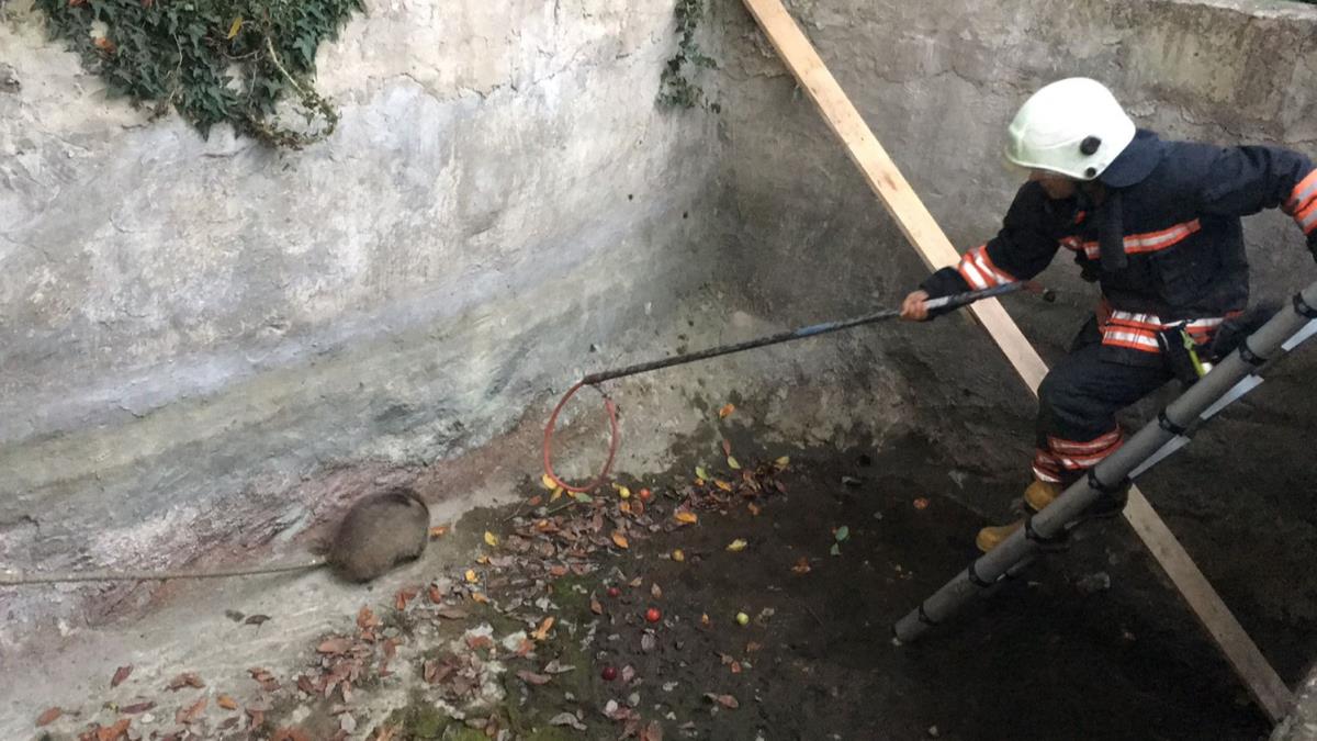 İtfaiye ekipleri, hayvan kurtarma aparatı yardımı ile porsuğu bulunduğu yerden alıp doğal yaşam alanına bıraktı.