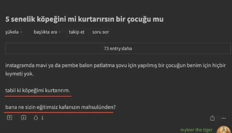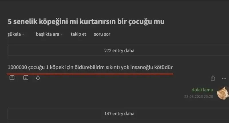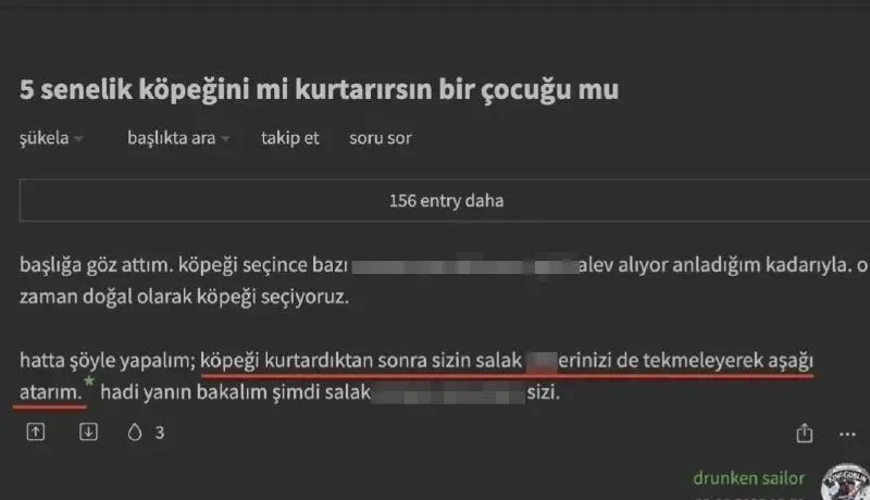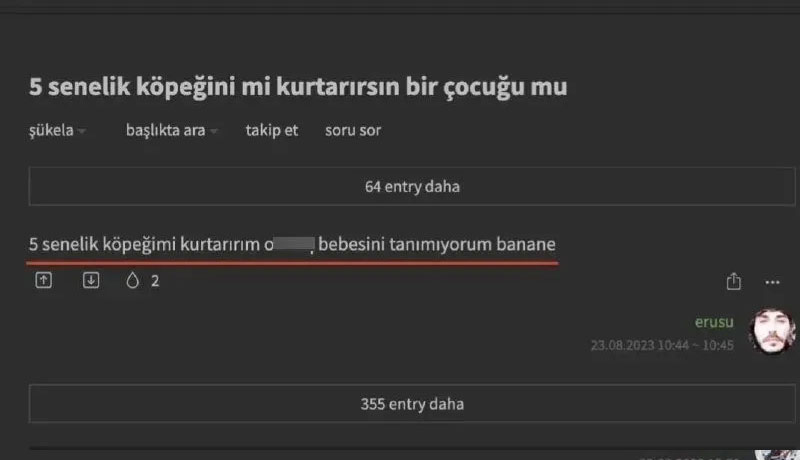 Ekşi Sözlük'te "5 senelik köpeğini mi kurtarırsın bir çocuğu mu?" adı altında açılan başlıkta insana nefret kusuldu. Sosyal medya kullanıcıları olaya tepki gösterdi.