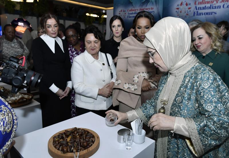 Lider eşlerine, coğrafi işaretli ürünlerden Gaziantep baklavası, Aydın inciri, Malatya kayısısı, Ezine peyniri, Antakya künefesi gibi birçok ürün ikram edildi.