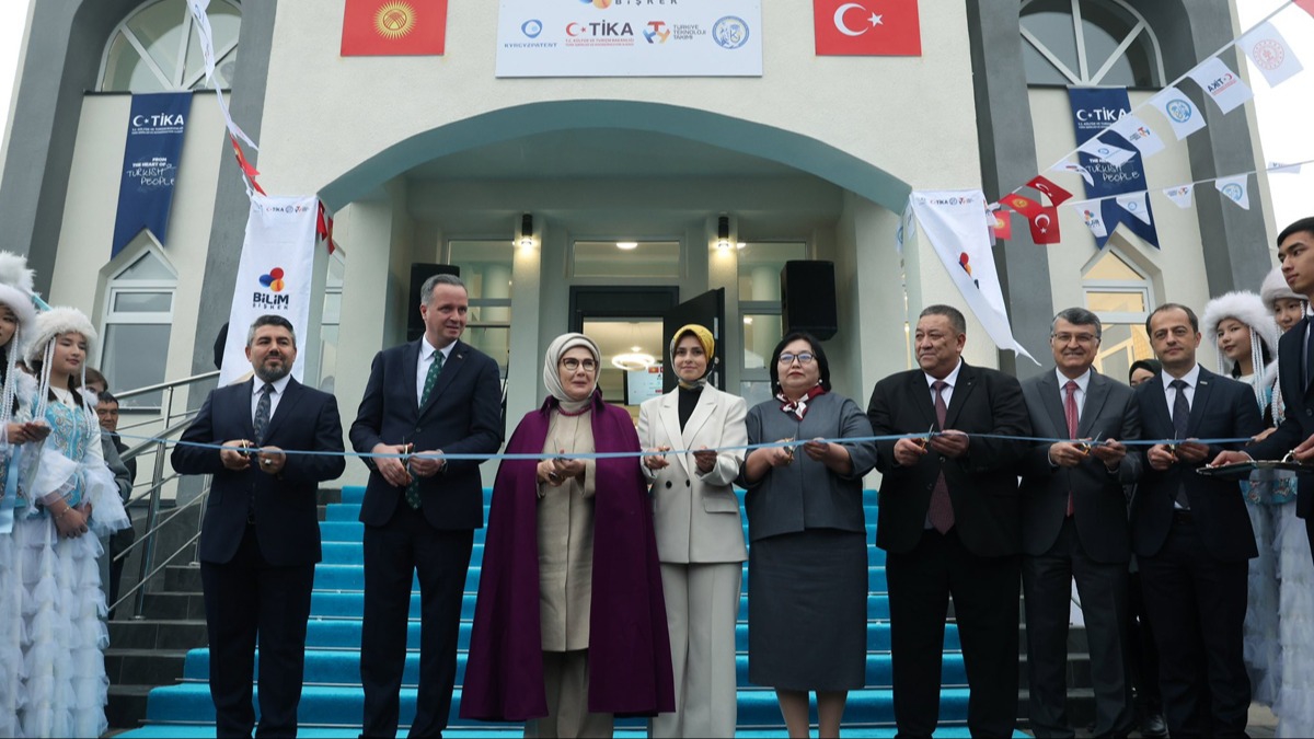 Kırgız halk dansları gösterisinin sunulduğu törende Emine Erdoğan, Azerbaycan ve Kuzey Kıbrıs Türk Cumhuriyeti'nden (KKTC) sonra Bişkek'te kurulan bilim merkezinin açılış kurdelesini "hayırlı olsun" dilekleriyle kesti.