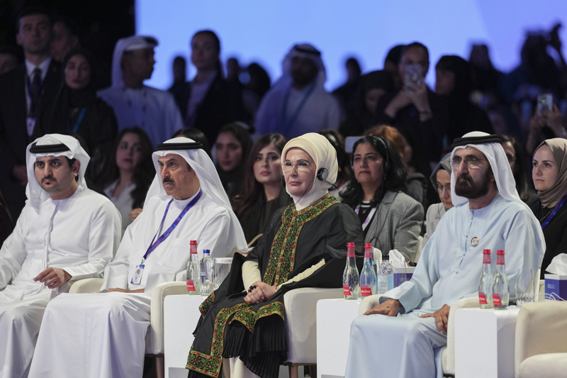 Emine Erdoğan, konuşmasını dinleyen Dubai Emiri, Şeyh Muhammed bin Raşid Al Maktum ve Kadın Kuruluşu Başkanı Şeyha Manal bin Raşid Al Maktum ve Dubai Kültür ve Sanat Kurumu Başkanı ve Dubai Yürütme Konseyi Üyesi Latifa bint Mohammed bin Rashid Al Maktum ile salona girişinde sohbet etti.