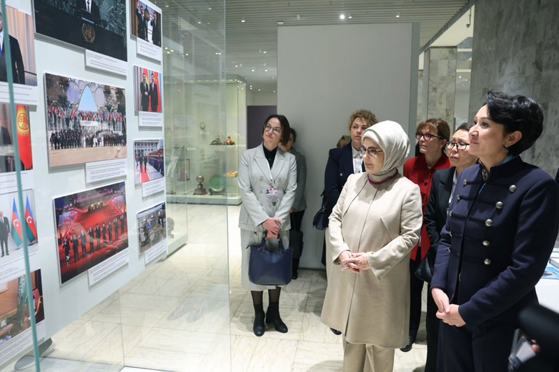 Emine Erdoğan ve lider eşleri, daha sonra, "Bil ki Devlet Güneşi Türk Burcunda Doğdu" başlığı altında, Türk Kültür ve Miras Vakfı tarafından, Türk Dünyası Vakfı işbirliğinde düzenlenen Divanu Lugati't-Türk Sergisi'ni gezerek, bilgi aldı. Lider eşleri, sergide yer alan Türk tasarımcı Ezgi Karayel'in tasarımını da inceledi.