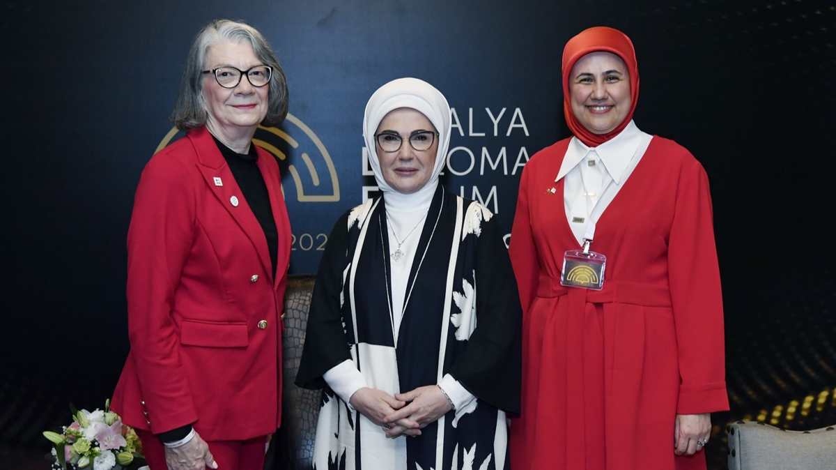 Antalya Diplomasi Forumu'na katılan IFRC Başkanı Forbes ile görüşen Emine Erdoğan, yeni görevi dolayısıyla Forbes'i tebrik etti, güçlü kadınların karar alıcı noktalarda olmasından duyduğu memnuniyeti dile getirdi.