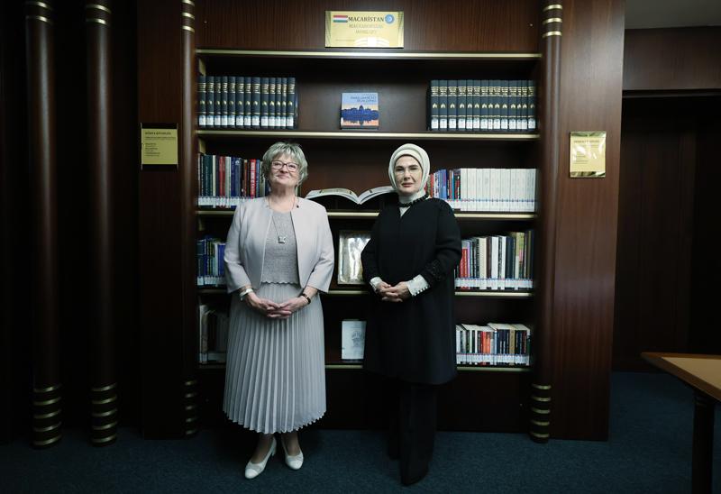 Cumhurbaşkanı Erdoğan'ın eşi Emine Erdoğan, Macaristan Cumhurbaşkanı Tamas Sulyok'un eşi Zsuzsanna Nagy ile Cumhurbaşkanlığı Millet Kütüphanesi'ni ziyaret etti. Emine Erdoğan, Nagy'yi kütüphanenin girişinde samimi şekilde karşıladı.