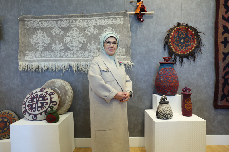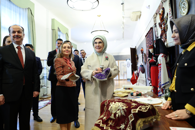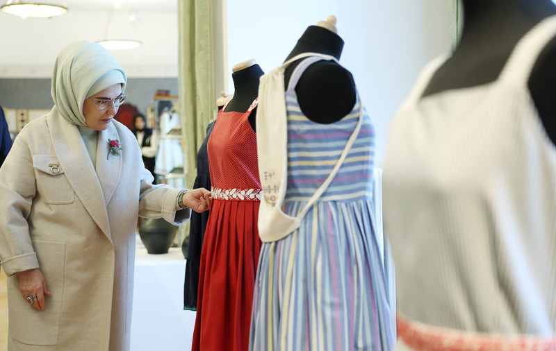 "Motiflerin Dili" projesi kapsamında İstanbul Beylerbeyi Sabancı Olgunlaşma Enstitüsü atölyelerinde hazırlanan koleksiyonlardan seçilen eserlerin, "Klasik Sanat Motifleri" ve "Anadolu Halk Motifleri" başlıklarıyla sunulduğu sergiyi gezen Emine Erdoğan, Türk ve Macar kültürlerine ait el sanatlarının ve motiflerin yer aldığı eserleri inceledi.