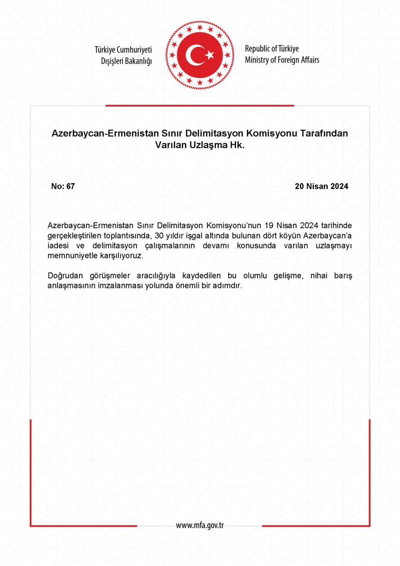 Bakanlıktan yapılan yazılı açıklamada, Azerbaycan-Ermenistan Sınır Belirleme (Delimitasyon) Komisyonunun dünkü toplantısında, 30 yıldır işgal altında bulunan 4 köyün Azerbaycan'a iadesi ve sınır belirleme çalışmalarının devamı konusunda varılan uzlaşmanın memnuniyetle karşılandığı belirtildi.
